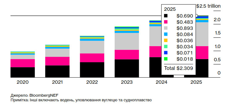 За даними BloombergNEF, світові інвестиції в енергетичний перехід минулого року зросли на 8% до рекордних 2,3 трильйона доларів, що всупереч побоюванням, що зміни політичного ландшафту та економічна невизначеність зупинять прогрес світу в галузі чистої енергетики.