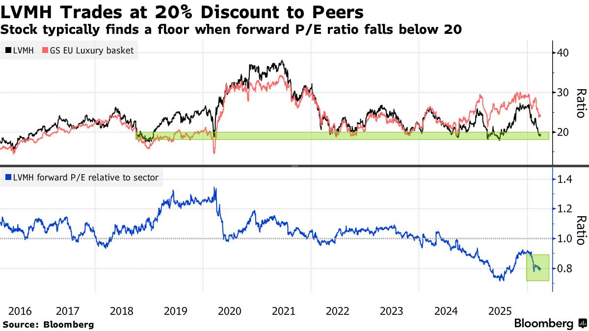 З огляду на низькі показники, акції LVMH зараз мають 20% знижку до аналогічних компаній, що є незвичною ситуацією для акцій, які мали преміальну ціну для сектору протягом більшої частини останнього десятиліття. Акції конгломерату класу люкс зараз торгуються нижче 20-кратного очікуваного прибутку протягом наступних 12 місяців — рівня оцінки, який служив нижньою межею для керуючих фондами протягом останніх чотирьох років, причому ціна акцій підстрибує щоразу, коли коефіцієнт ціна/прибуток падає до 20.